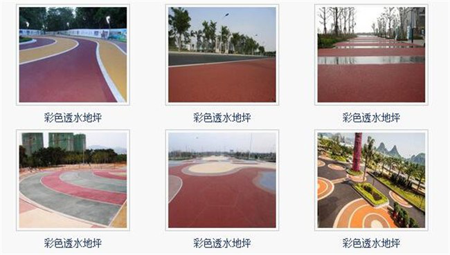 彩色透水地坪:用水泥、特殊添加剂、骨料、水依照一定配比混合制成,彩色透水地坪是一种直接在施工现场一次性成坪铺设的透水混凝土,其鲜亮的颜色独具魅力。
